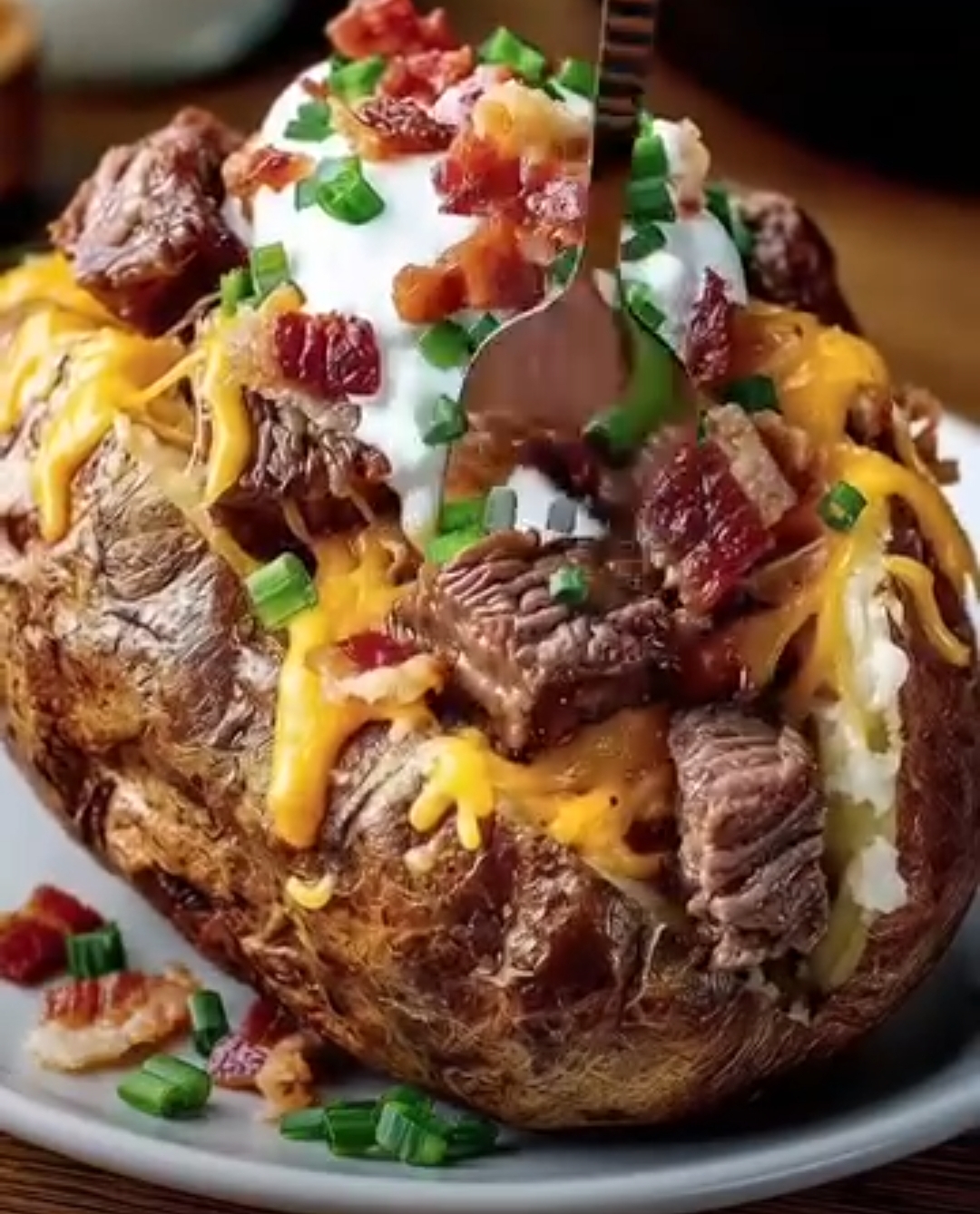Use high-quality ribeye for maximum tenderness and flavor. For a lighter version, swap sour cream for Greek yogurt. To make the dish even more indulgent, drizzle barbecue sauce or creamy ranch over the top before serving. If you like extra crispiness, place the loaded potatoes under the broiler for one to two minutes to caramelize the cheese layer.