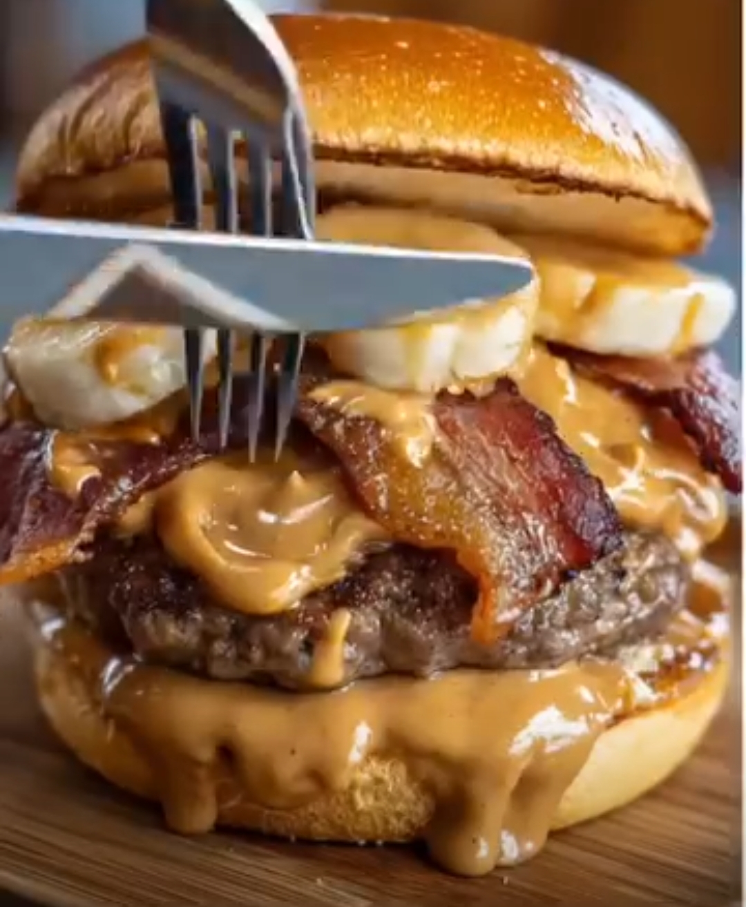 The Peanut Butter Banana Bacon Burger might sound unconventional, but one bite is all it takes to understand why it works. The creamy peanut butter enhances the juiciness of the beef, the bananas add sweetness and texture, and the bacon delivers the perfect salty crunch. Itโs an unexpected fusion of flavors that transforms an ordinary burger into a gourmet experience โ adventurous, comforting, and utterly delicious.