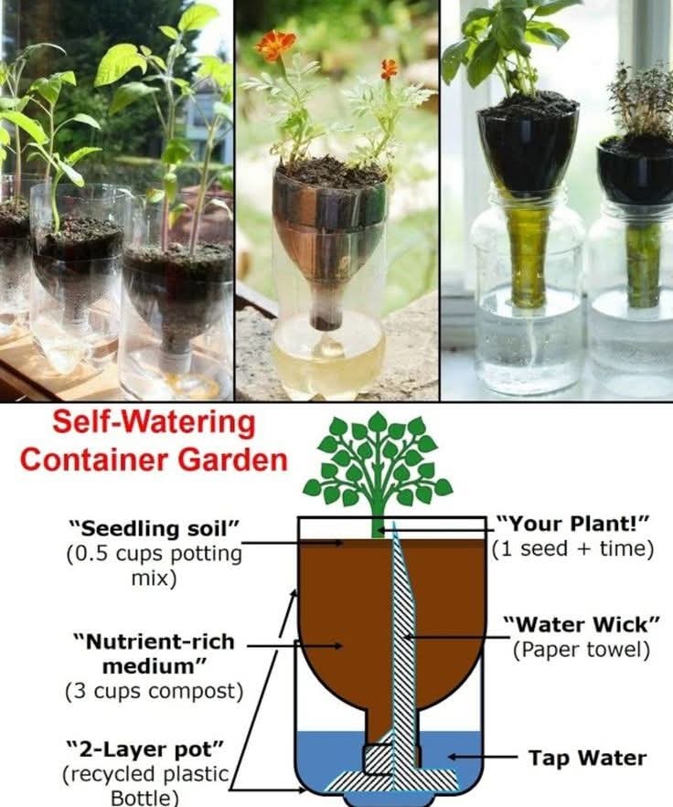 This self-watering container garden is a brilliant blend of simplicity and sustainability. With just a few recycled bottles and household items, you can create a mini eco-friendly growing system that keeps your plants lush and thriving — even when life gets busy. 🌱♻️