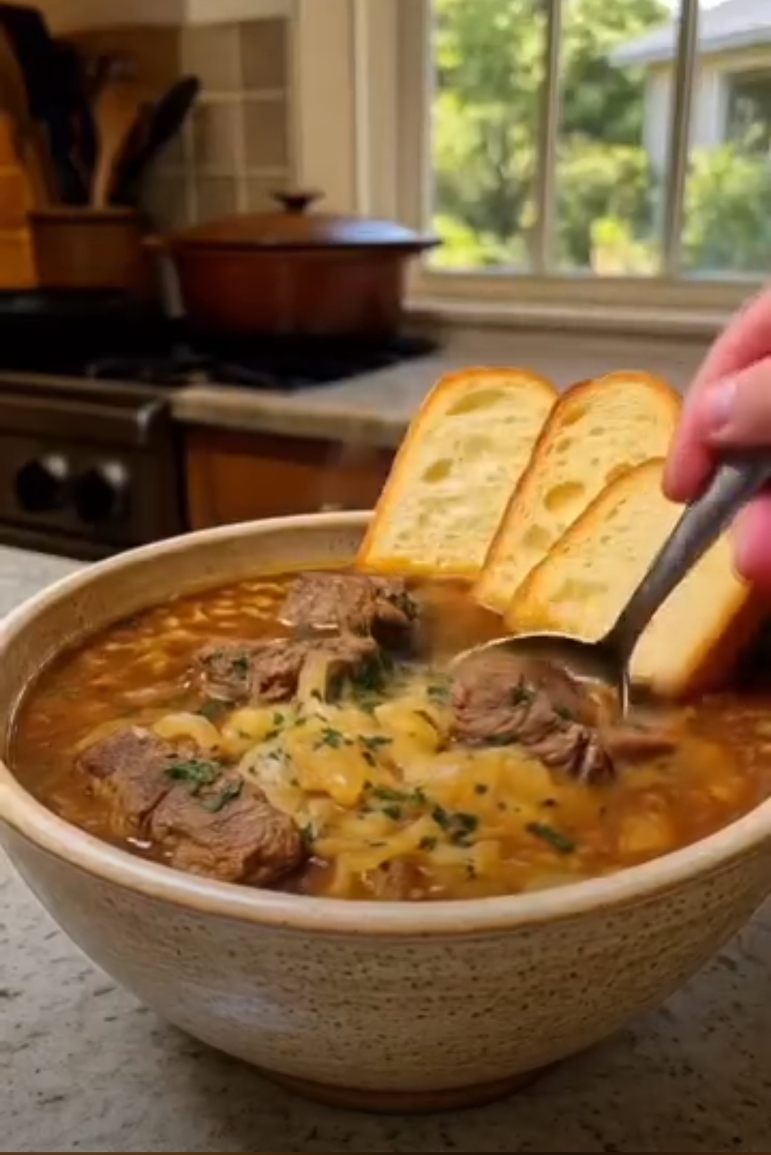 This hearty French Onion Soup with Beef is pure stovetop comfort — deeply caramelized onions, tender seared beef, rich broth, and golden toasted bread buried under a blanket of melted cheese. Unlike slow-cooker versions, this recipe builds flavor the classic way: browning the beef first, then slowly coaxing sweetness and depth from the onions until they turn buttery and golden. Every spoonful is savory, cozy, and incredibly satisfying.