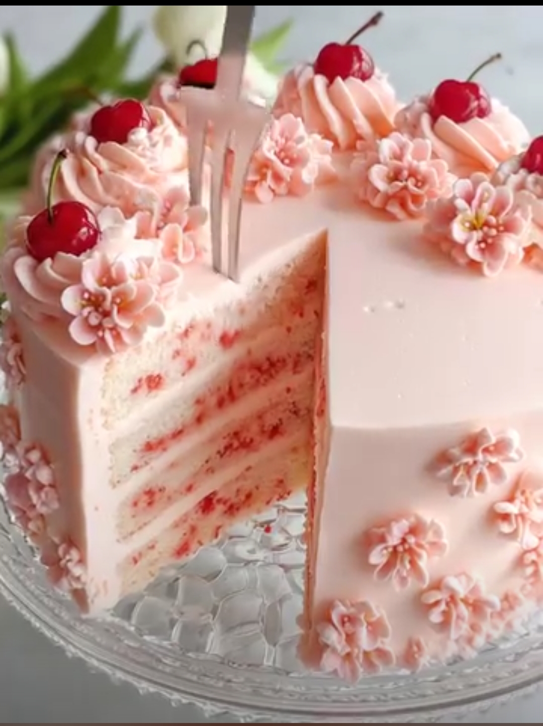 Blush Pink Cherry Blossom Cake is a soft, tender cherry-infused cake with a delicate pastel-pink crumb, layered with smooth creamy frosting and decorated with dainty buttercream flowers for an elegant, spring-inspired finish. Lightly sweet with subtle cherry flavor, it’s a beautiful dessert for celebrations, birthdays, showers, or any occasion that calls for something charming and feminine.