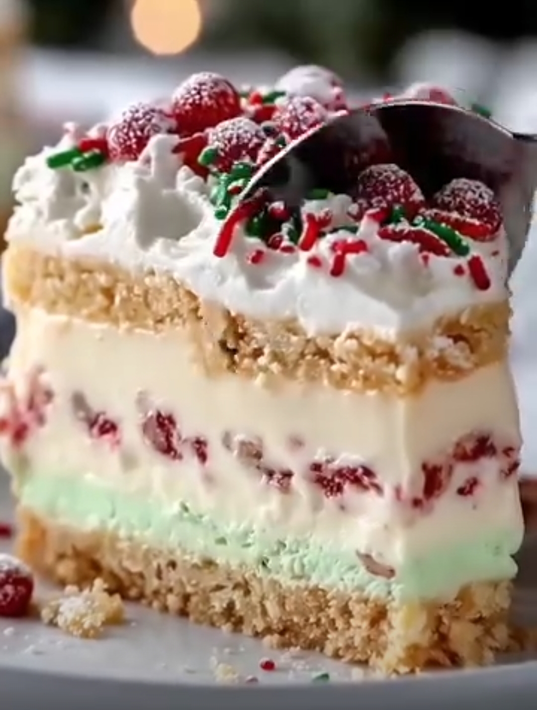 A festive, creamy, multi-layered holiday dessert with a buttery sugar-cookie base, smooth vanilla cream filling, and colorful crunchy toppings. Easy, cheerful, and perfect for Christmas parties.