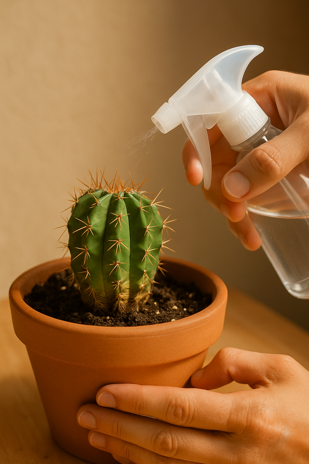 To revive a weak or wrinkled cactus, use deep, slow watering — not misting. Misting, as shown in the photo, doesn’t hydrate the cactus internally. Instead, you must thoroughly saturate the root zone.