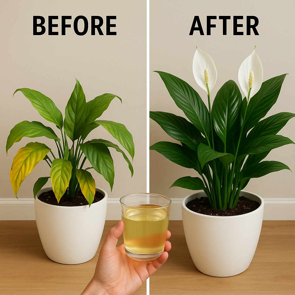 Try the “liquid gold” method and watch your Peace Lily transform from struggling to stunning—just like the before-and-after photo.