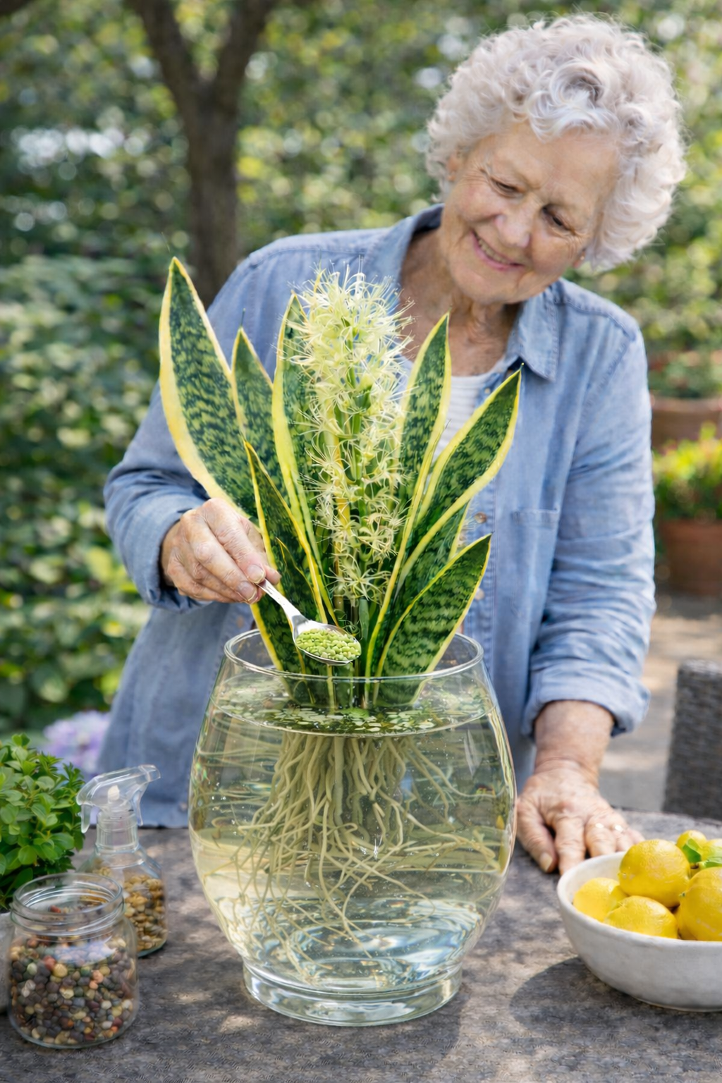 While snake plants grow well in plain water, gentle nutrients can boost performance.