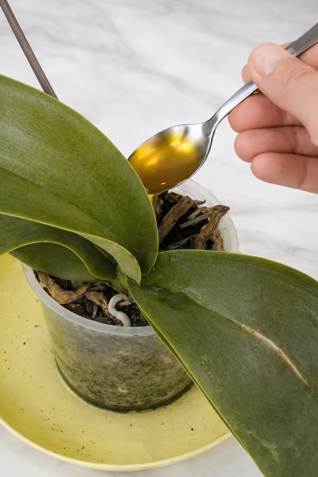 Orchids absorb through roots — not leaves.