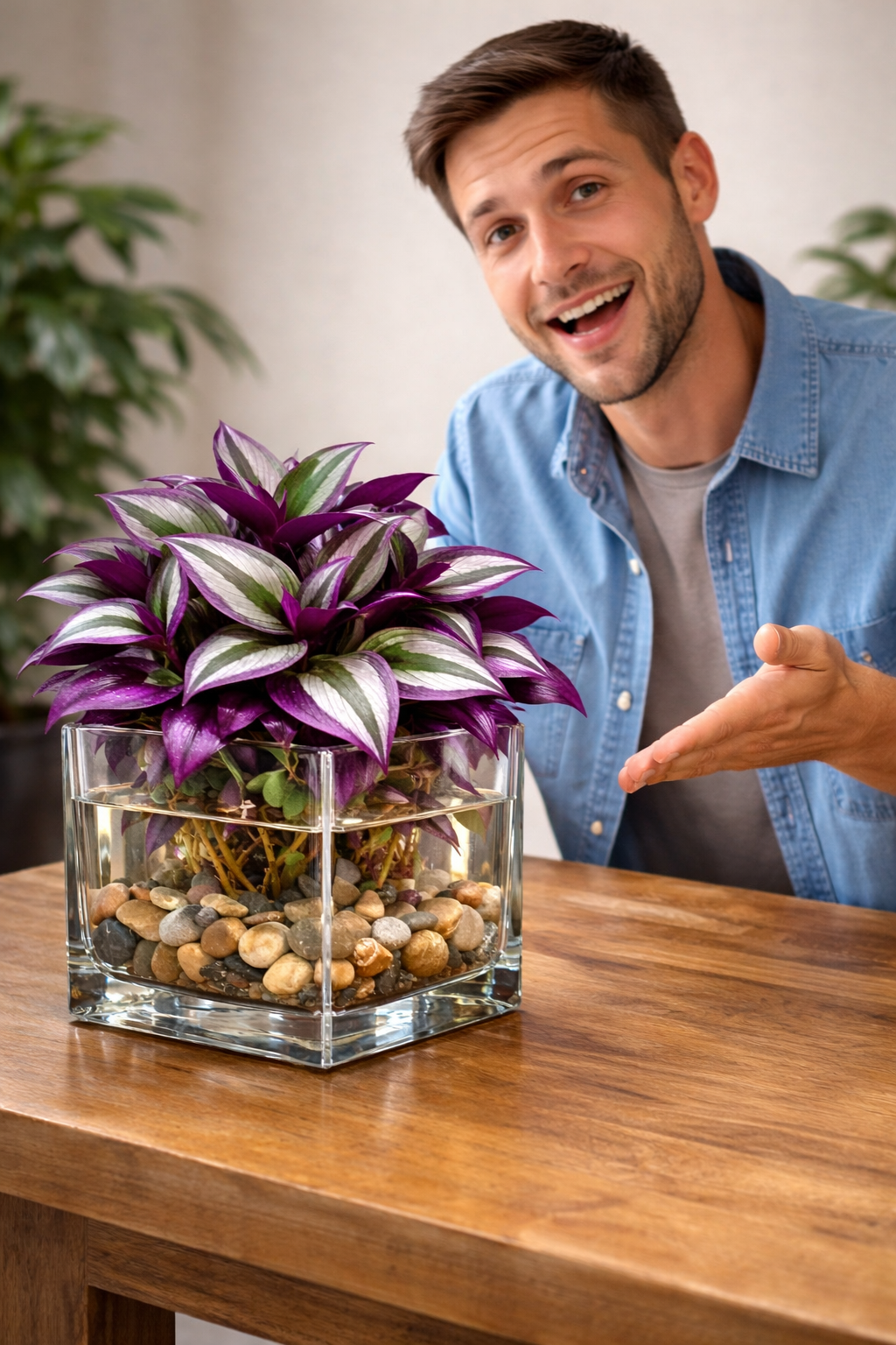 Water-grown plants are quickly becoming one of the most talked-about modern decor trends β and the purple plant displayed in the glass cube vase is a perfect example. Known as Tradescantia zebrina, this fast-growing trailing plant adapts beautifully to hydro setups and fits effortlessly into minimalist interiors.