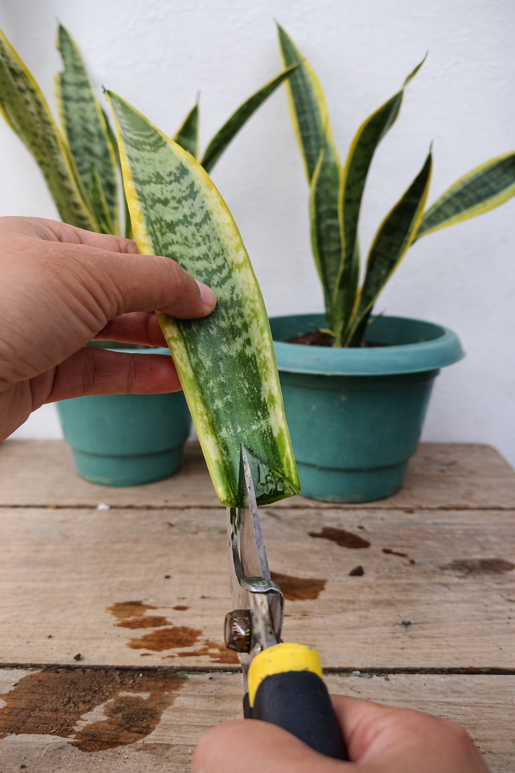 Use sanitized scissors or pruning shears and cut the leaf into sections around 5β10 cm long.