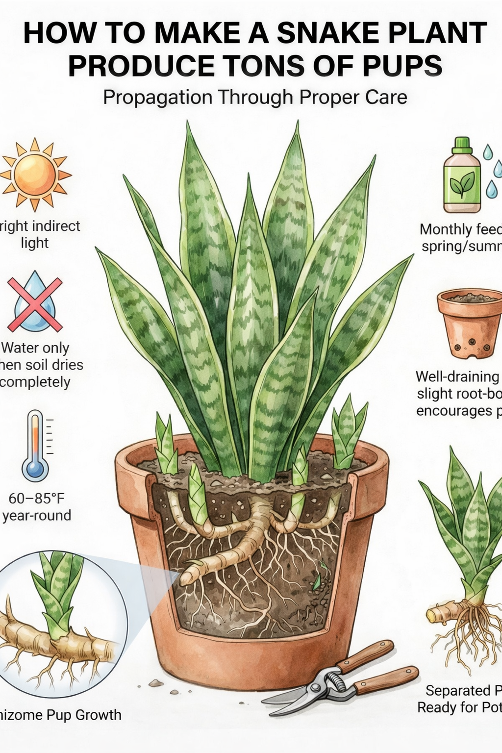 Snake plants are already known as one of the easiest indoor plants to grow β but many gardeners donβt realize that one small care adjustment can dramatically increase how fast they produce new pups. Instead of complicated propagation tricks, the real secret comes from proper light balance, root space control, and gentle feeding routines that encourage natural rhizome growth under the soil.