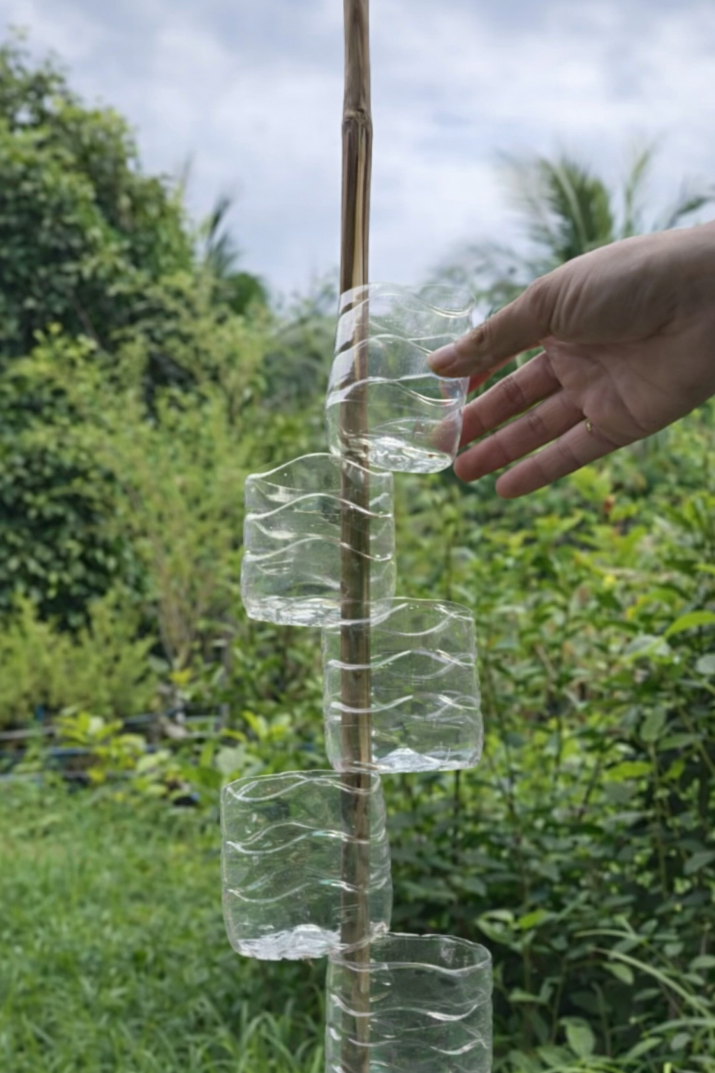 Vertical gardening helps maximize limited space while keeping plants elevated and accessible. When bottles are attached securely to a support pole or frame, each plant receives better light exposure and improved drainage compared to crowded pots on the ground.