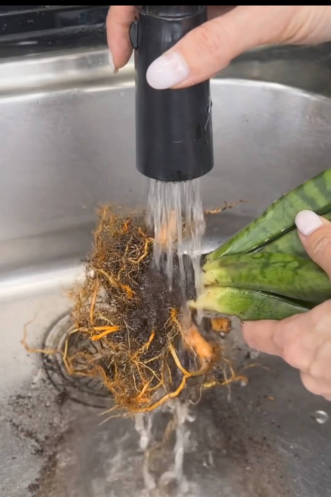 A soft stream of water helps remove old soil without damaging healthy roots.