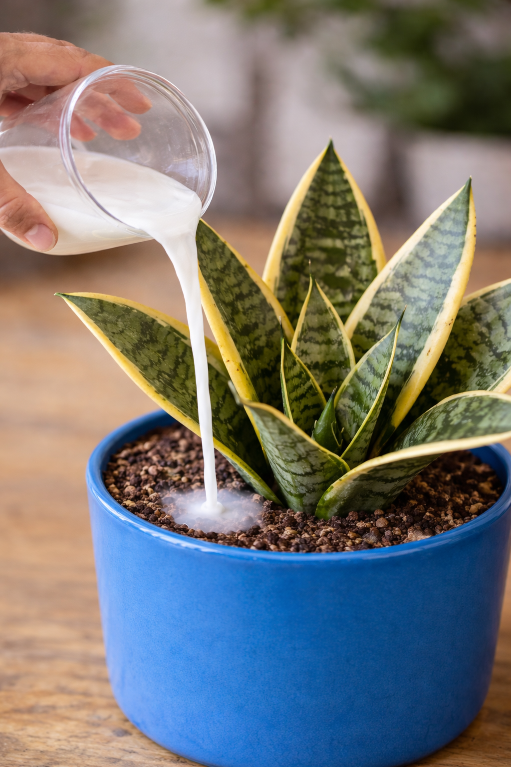 In the image, a white diluted liquid is being poured slowly into well-draining soil. Gardeners often create mild plant-support infusions using simple, low-cost ingredients diluted heavily with water.