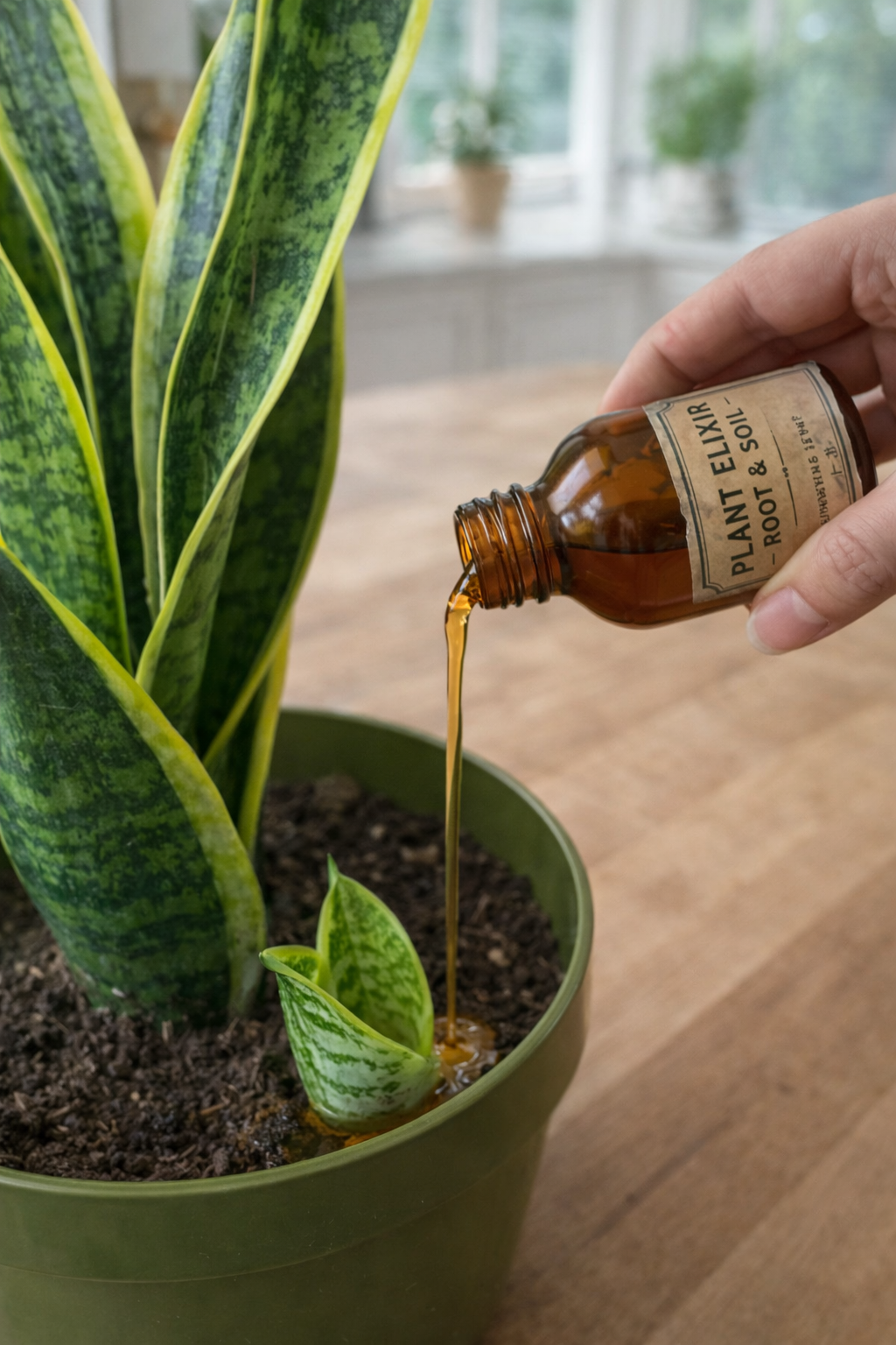 In the image, a small amber bottle labeled “Plant Elixir – Root & Soil” is being poured gently into the soil near the base of a snake plant.