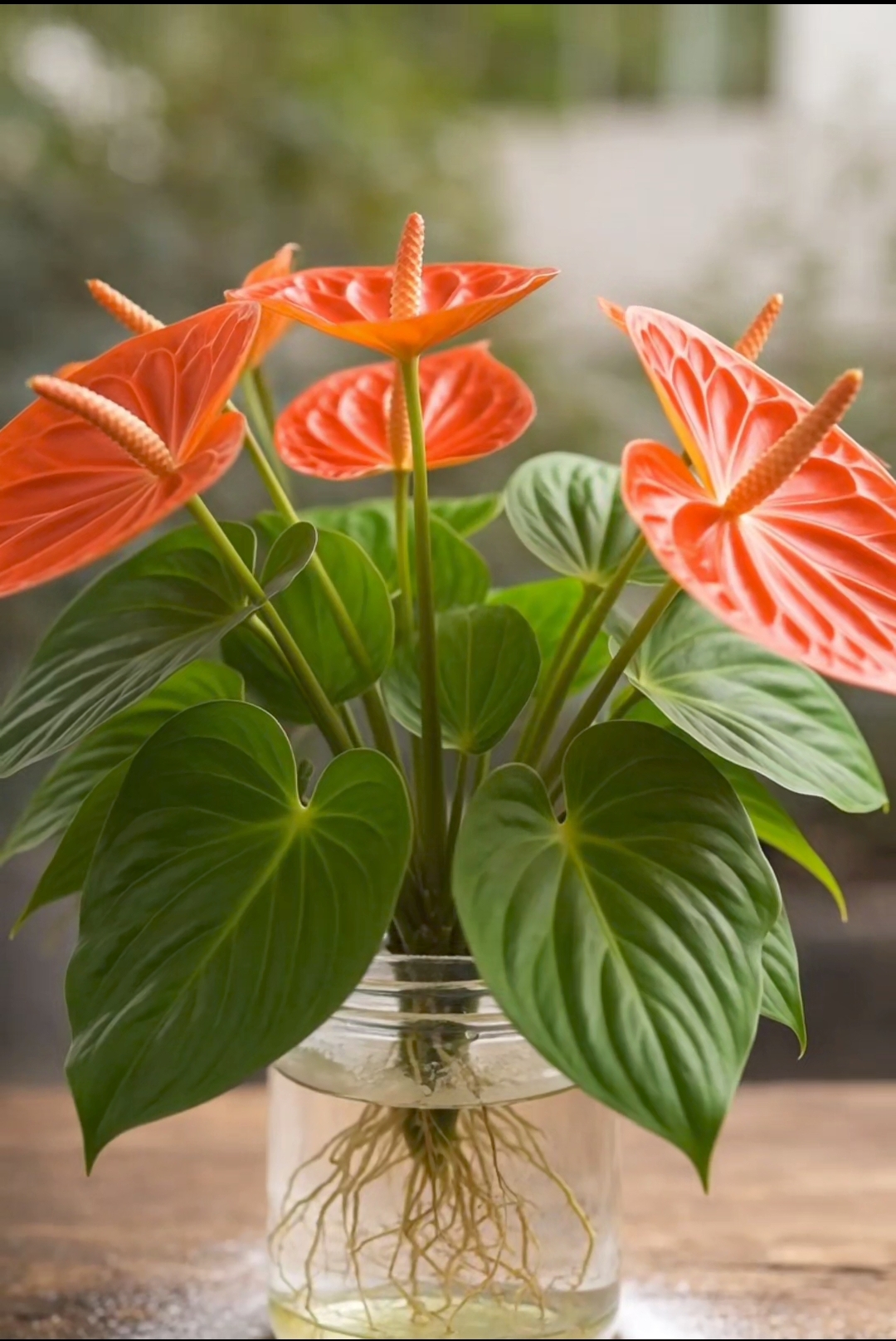 The simple jar technique shown in the image demonstrates how Anthuriums can grow with their roots suspended in water while the foliage and flowers remain above the container. This clean and minimalist approach is gaining attention among indoor plant enthusiasts.
