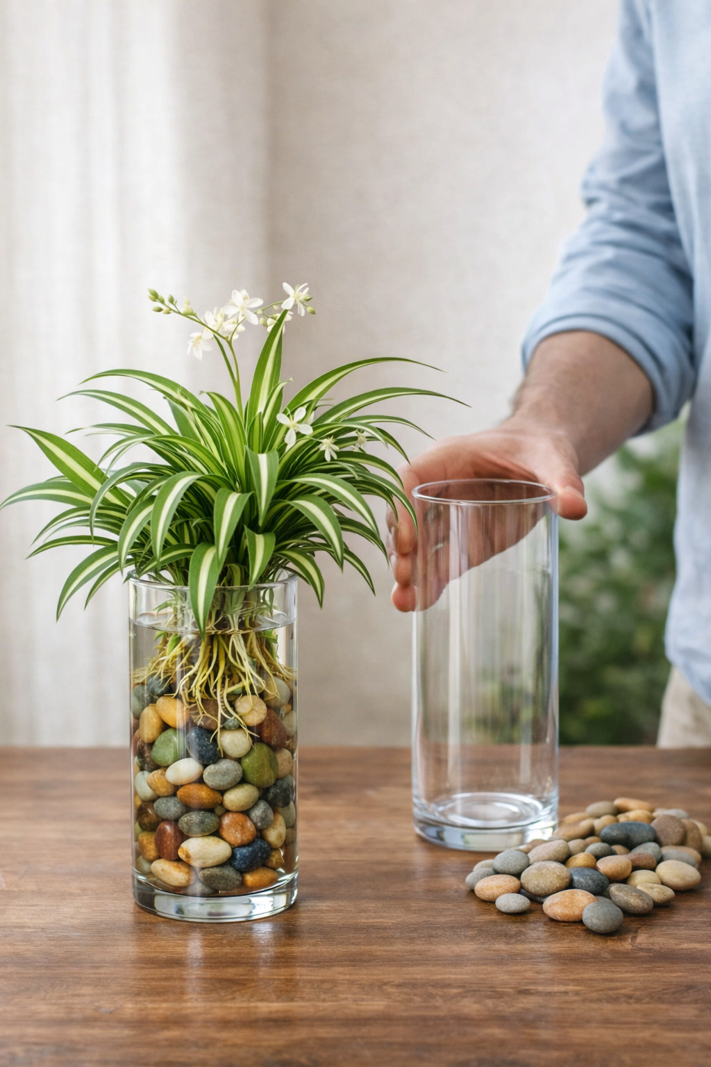 Recently, indoor plant enthusiasts have started experimenting with a simple jar method using decorative stones and water, like the setup shown in the image. This technique allows spider plants to grow in a clean, minimalist container while still supporting healthy roots.