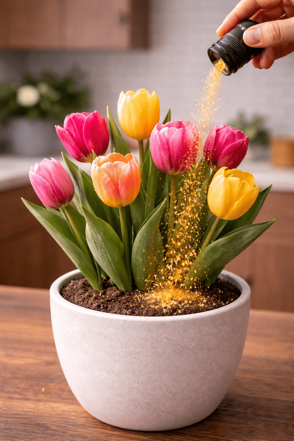 👉 Sprinkling a “golden powder” on the soil to boost tulip growth and flowering.