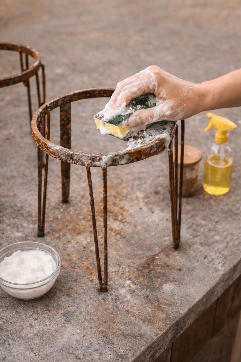 Mix baking soda with a small amount of water until it becomes a thick paste. Apply it to rusty sections, especially around the top ring, leg joints, and any visibly orange-brown areas.